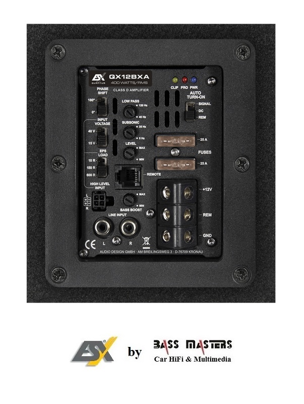 In den High-End QXP-Gehäusen arbeitet das mehrfach ausgezeichnete POWER4 Class D Aktivmodul, das mit satten 1000 Watt Peak an 4 Ohm souveräne Leistungsreserven bereitstellt. Das Modul verfügt über eine ausgeklügelte Schaltungstechnik im Eingang: Dank des von ESX entwickelten „EPS PRO“ High-Level-Inputs ist das Modul vollständig kompatibel mit modernen Fahrzeugen und deren sensiblen Fehlerdiagnose-Systemen. Auch bei der Ausstattung zeigt sich das Modul kompromisslos: regelbare Subsonic- und Lowpass-Filter, Bass Boost sowie ein Phasenschalter ermöglichen eine präzise Abstimmung des Bassfundaments. Die Signalzuspielung erfolgt wahlweise über Cinch oder High-Level-Eingänge. Für maximalen Komfort sorgt die im Lieferumfang enthaltene Basspegel-Fernbedienung, mit der sich der Basspegel jederzeit bequem vom Fahrersitz aus regeln lässt.